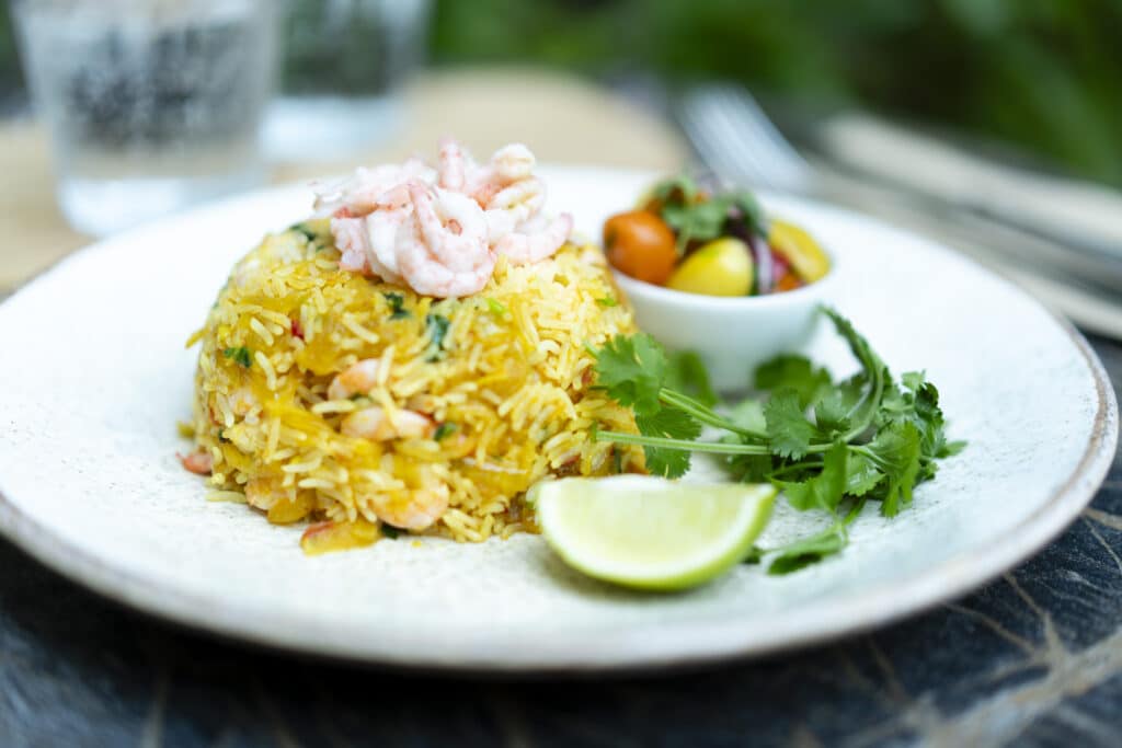 Handskalade räkor, basmatiris, lök, vitlök, chili, koriander, russin